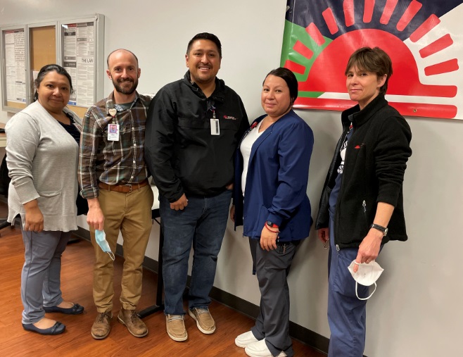 Pictured from left to right are colleagues of Omar Gutierrez at Monfort Family Clinic - Diana Serna, clinic manager; Dr. Sean Filipovitz, site medical director; Omar Gutierrez, stroke patient; Kimberly Alvarez, medical assistant supervisor; Denise Rush, registered nurse.